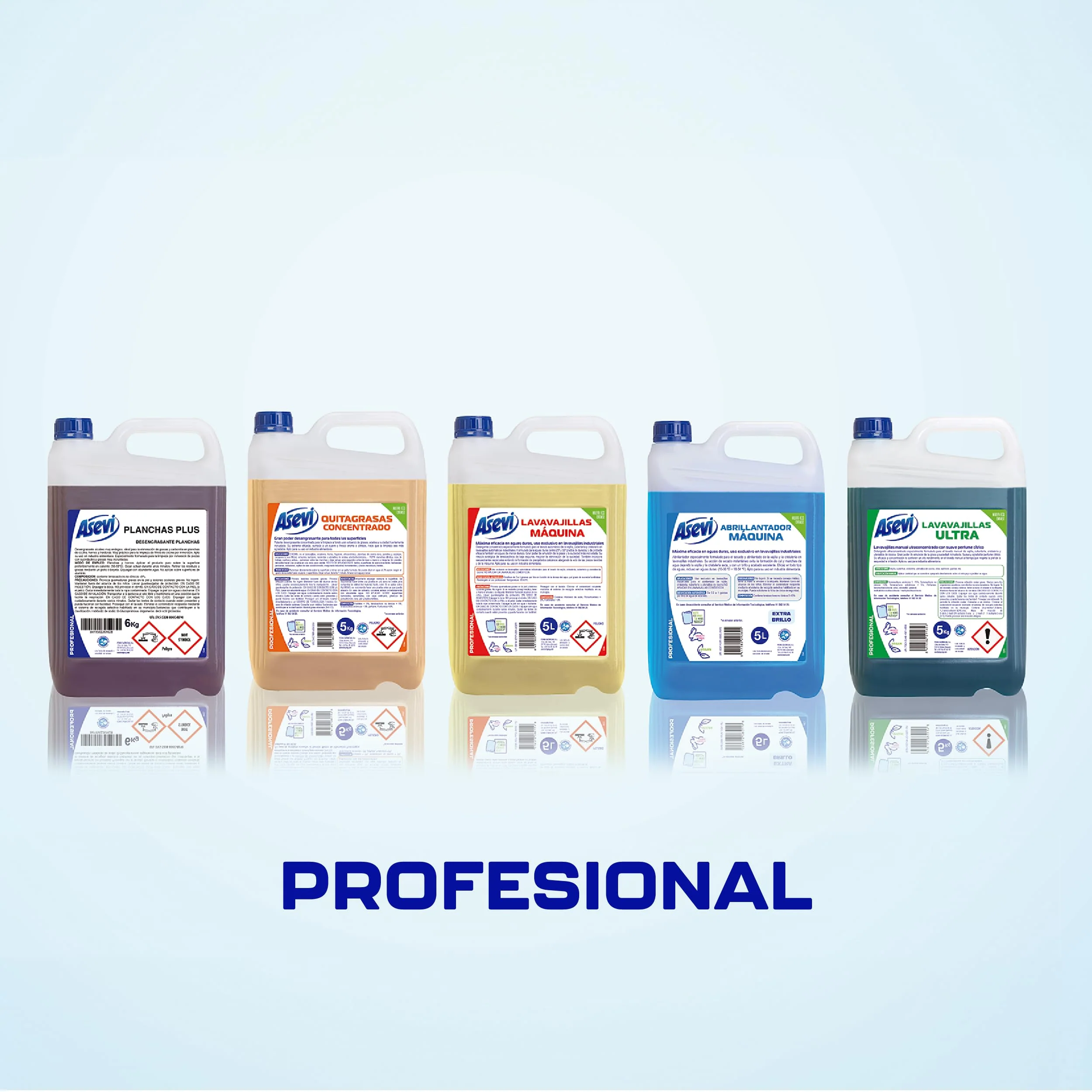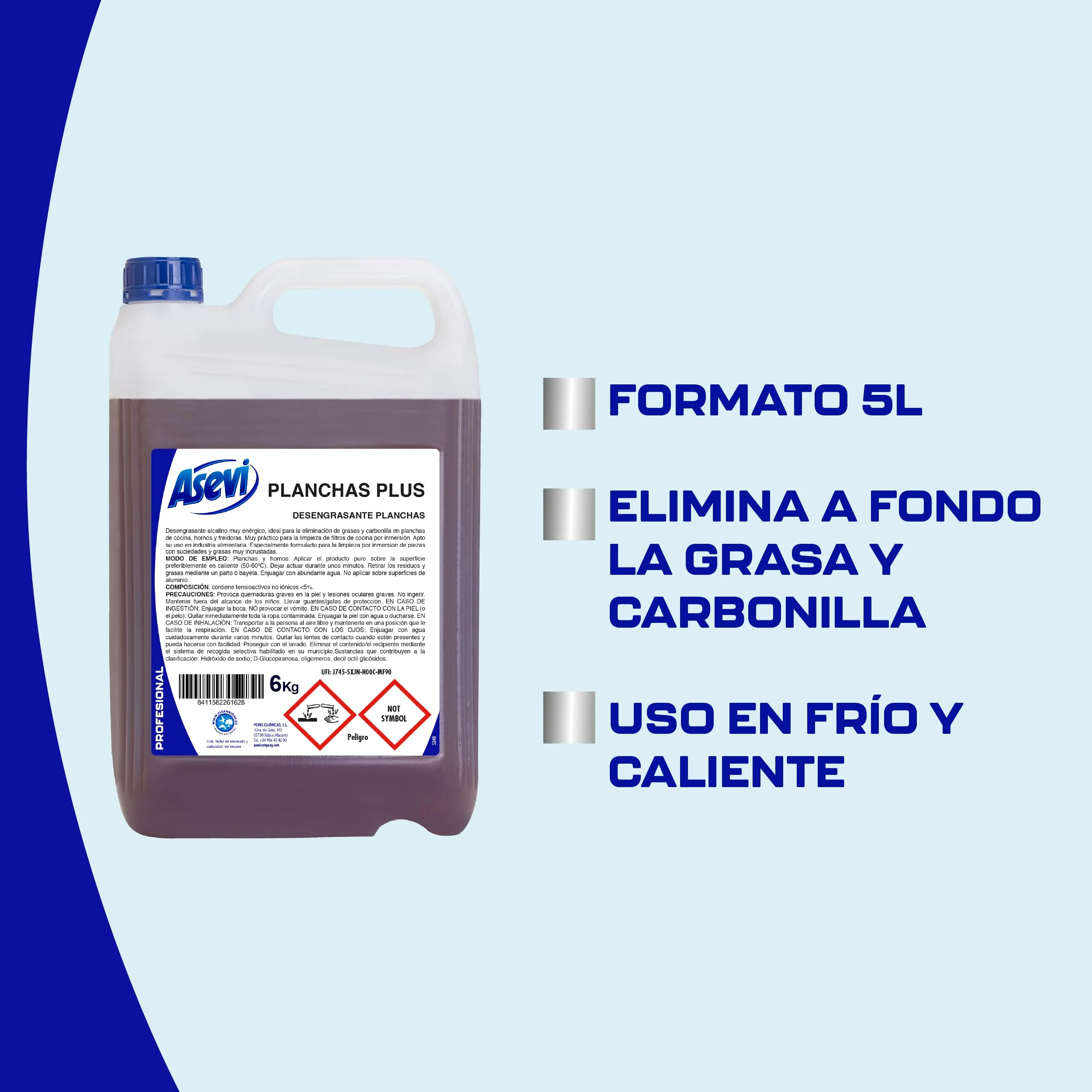 - Desengrasante Planchas Plus Asevi Profesional: Este potente desengrasante, en un formato conveniente de 5 litros, está diseñado para una limpieza eficaz de grasa y carbonilla adherida en planchas de cocina, hornos y freidoras.