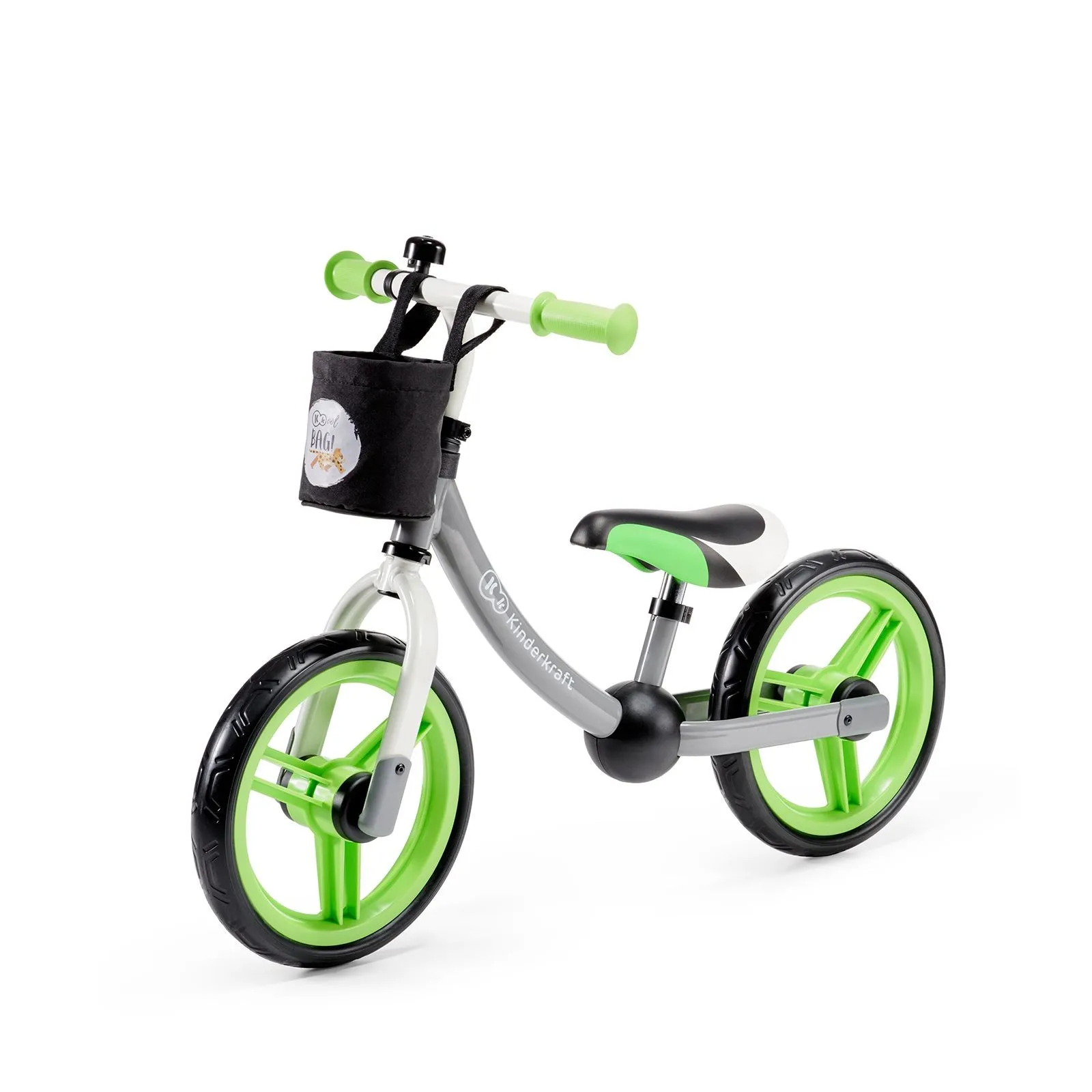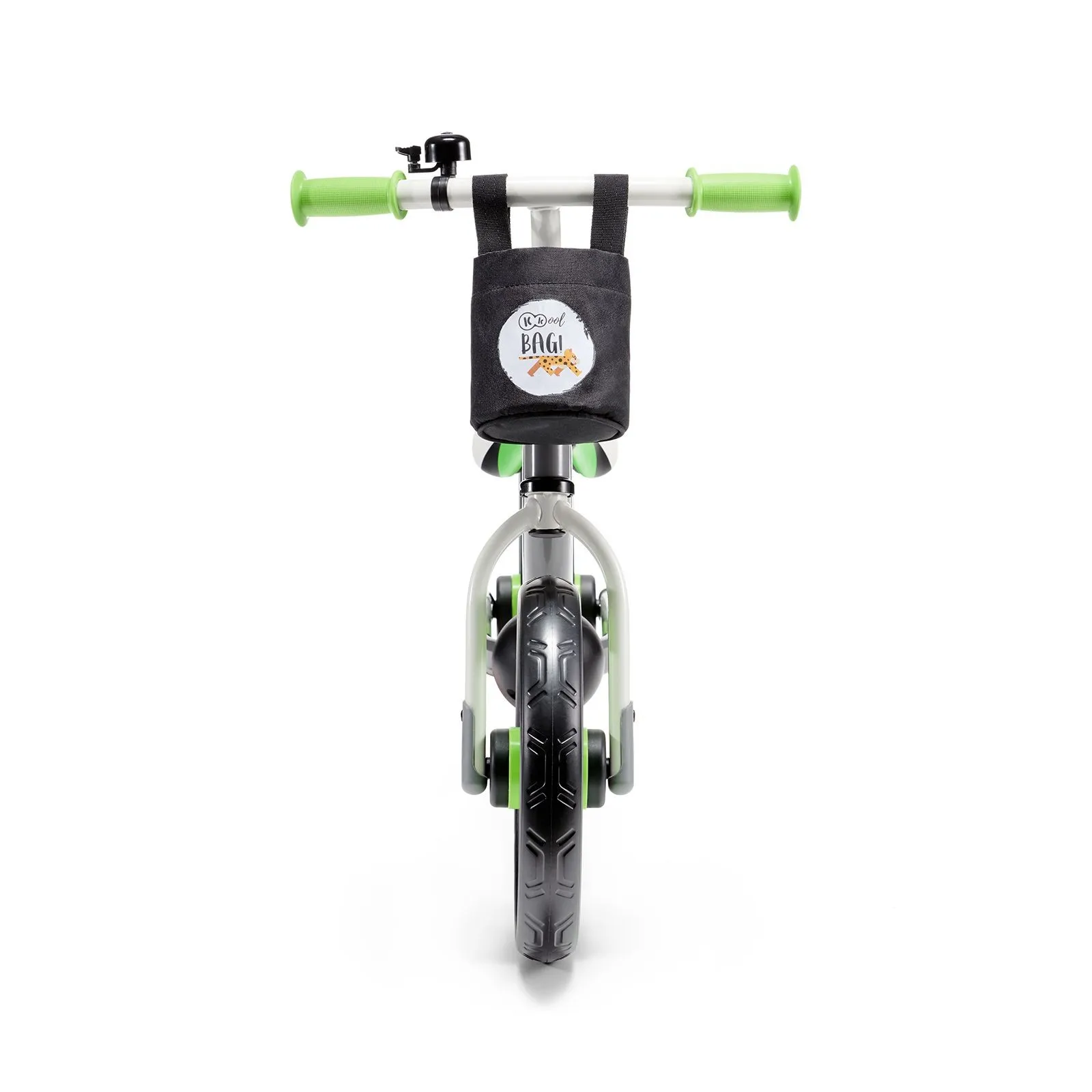 El timbre montado en el volante permite al niño advertir a los ciclistas y peatones, y el bolso de tela es ideal para tesoros.