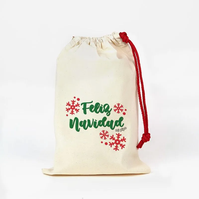 – Se puede añadir como extra una bolsita de algodón orgánico para regalo de 14 x 22 cm con el texto Feliz Navidad como se ve en la imagen.