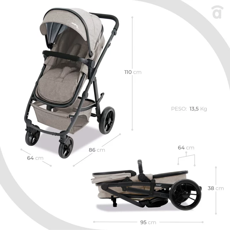 El carrito de bebé Two+ 2 es un cochecito para el bebé multifuncional que crece con el niño ya que soporta hasta 22 kg de peso. El capazo se transforma con unos pocos movimientos en la silla de paseo, y el chasis cuenta con unas ruedas grandes con amortiguación para poder pasear por cualquier terreno, además de poder ajustar el manillar en altura para llevarlo de forma más cómoda.