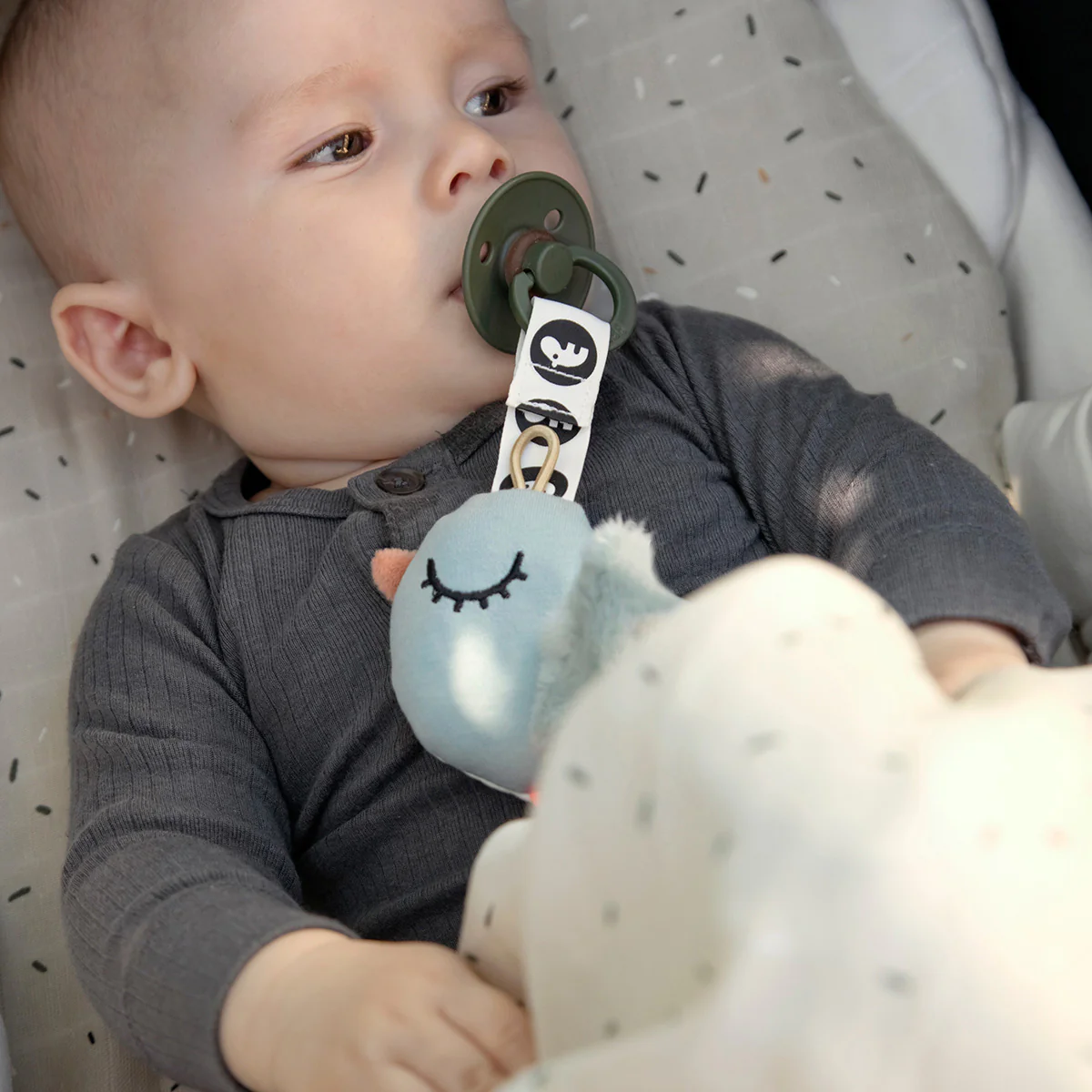 Será un compañero de sueño familiar para tu bebé y se asegurará de que ningún chupete se escape volando. El Cozy keeper tiene un práctico cierre de velcro y una presilla elástica para sujetar chupetes con y sin asas.