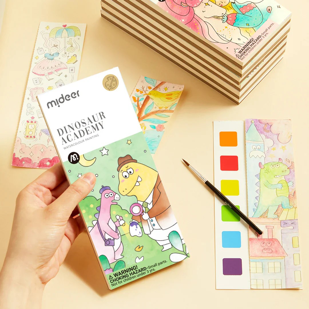 El set incluye un pincel y 6 colores de pigmento para cada una de las 20 ilustraciones.