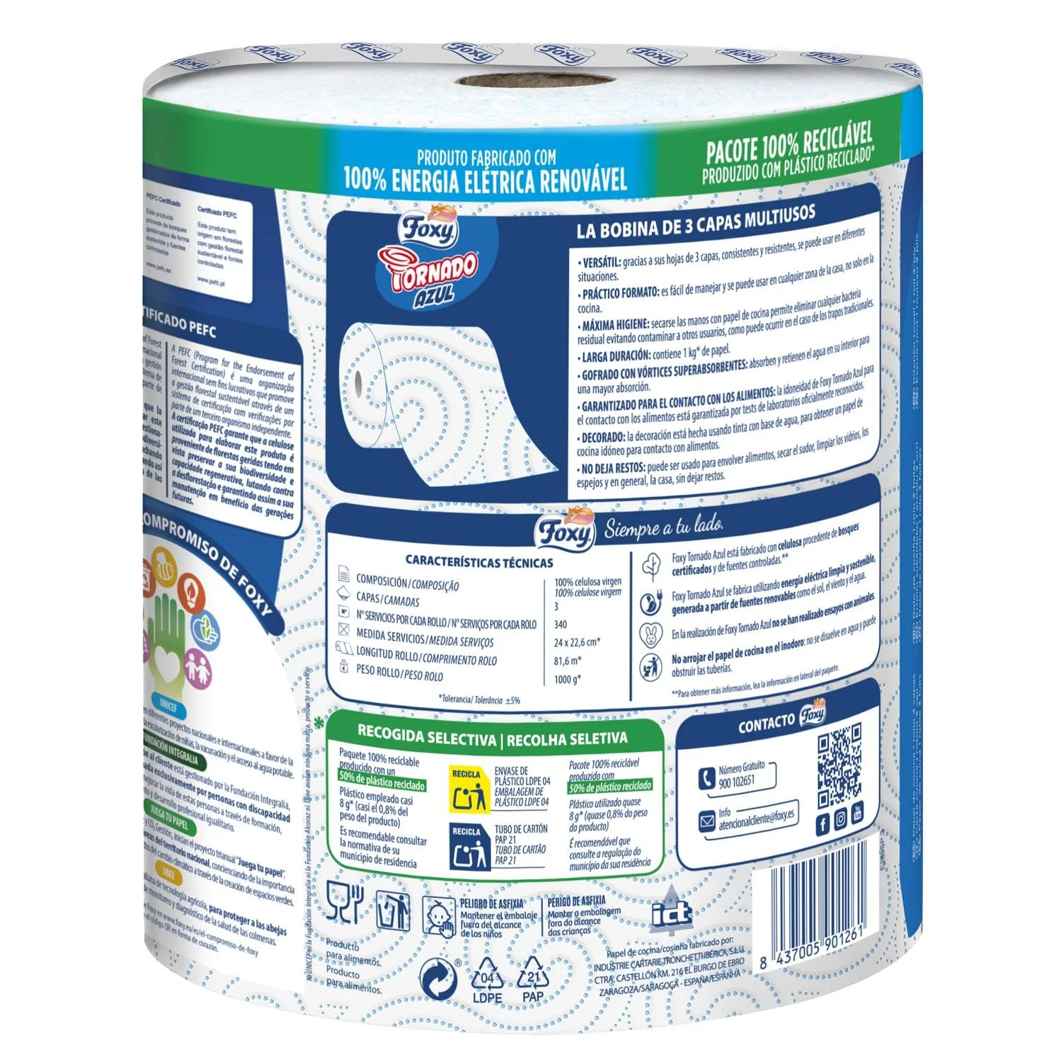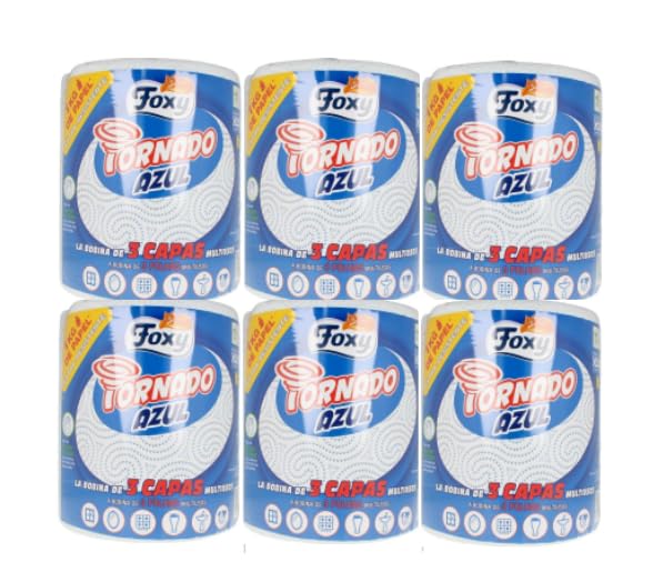 Foxy Tornado Azul es la bobina multiusos, para quien no renuncia a la calidad de las 3 capas. La combinación de las 3 capas y los óptimos vórtices superabsorbentes, patentados por Foxy, le da a Foxy Tornado Azul un extraordinario poder absorbente y resistente. Un rollo Foxy Tornado contiene 1kg de papel, sin embargo es fácil de manejar y se puede utilizar en cualquier zona de la casa. Cada uno de sus 340 servicios triple espesor que garantiza la máxima eficiencia para cualquier uso, en cocina y para la limpieza doméstica, incluso para el sudor y limpiar o secar animales domésticos. Foxy Tornado Azul es una elección de Óptima higiene: secarse las manos con papel, en vez de las toallas tradicionales, permite eliminar eventuales bacterias residuales evitando transmitirlas al siguiente usuario. Su uso está garantizado para el contacto con alimentos y compatible con el microondas. La idoneidad está garantizada por rigurosos test realizados en laboratorios cualificados. Además, su uso es compatible con el microondas para calentar y/o descongelar los alimentos (seguir las instrucciones impresas en el embalaje). Foxy Tornado Azul está producido con 100% celulosa virgen proveniente de bosques gestionados de manera responsable y garantizado por la certificación PEFC. El embalaje es reciclable y producido con un 50% de plástico reciclado. Todos los productos Foxy están producidos con Energía eléctrica renovable. Este formato contiene e6 rollos de papel cocina 3 capas Foxy Tornado Azul, 340 servicios por rollo y longitud total 81,6m por rollo (tolerancia +/- 5%). Foxy, siempre a tu lado.