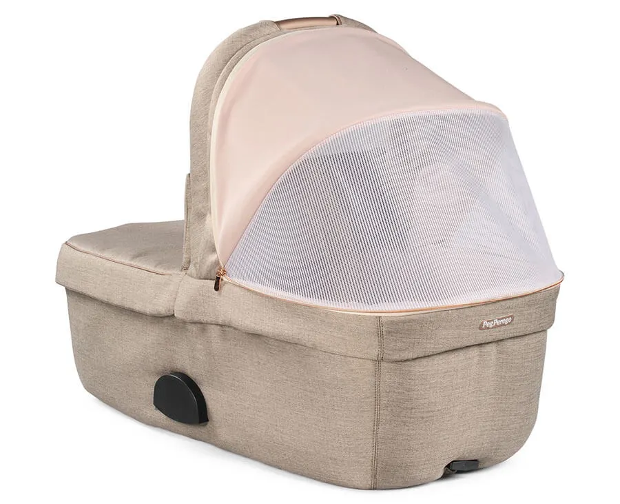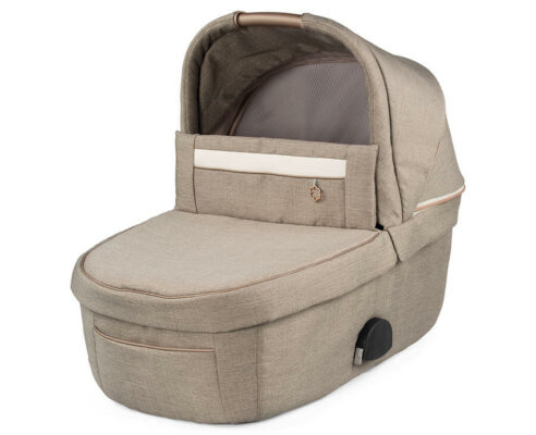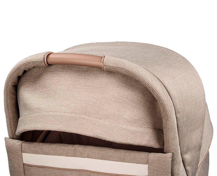 La elegante asa de transporte integrada de piel sintética con patente Peg Perego. Puedes bajar la capota con una sola mano, incluso mientras llevas a tu bebé en brazos.