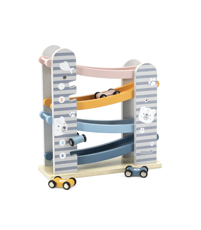 Un conjunto de juego de tobogán de vehículos que incluye 4 minicoches numerados en distintos colores.