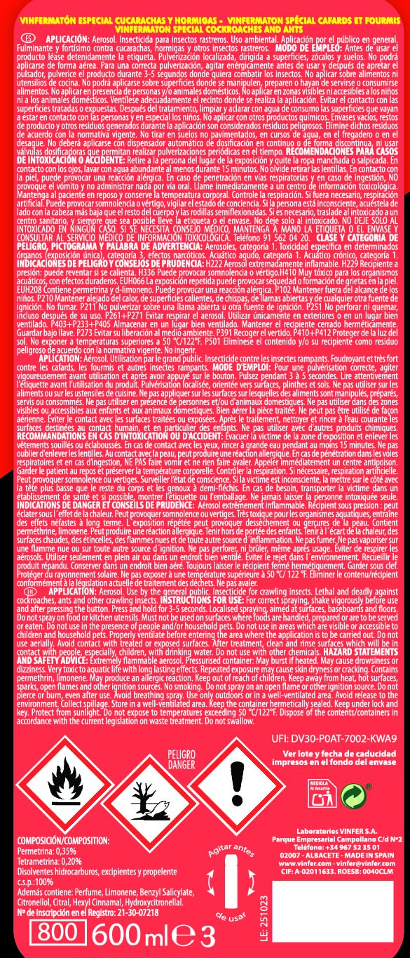VINFERMATON – Insecticida Matén Cucas Cucarachas y Hormigas Instanténeo 600ml